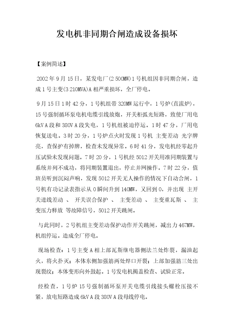 发电机非同期合闸造成设备损坏