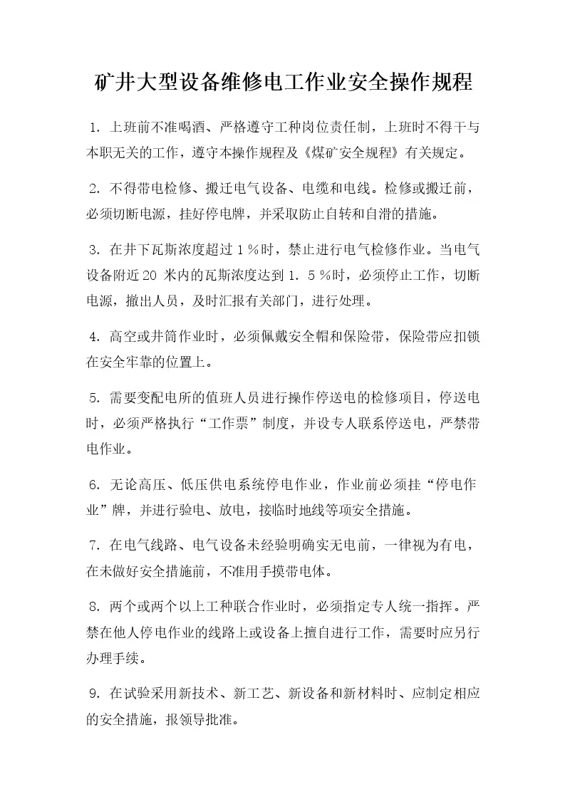矿井大型设备维修电工作业安全操作规程